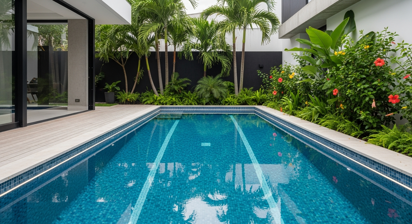 - Kolam Renang Pribadi – Desain minimalis dengan sistem filtrasi modern